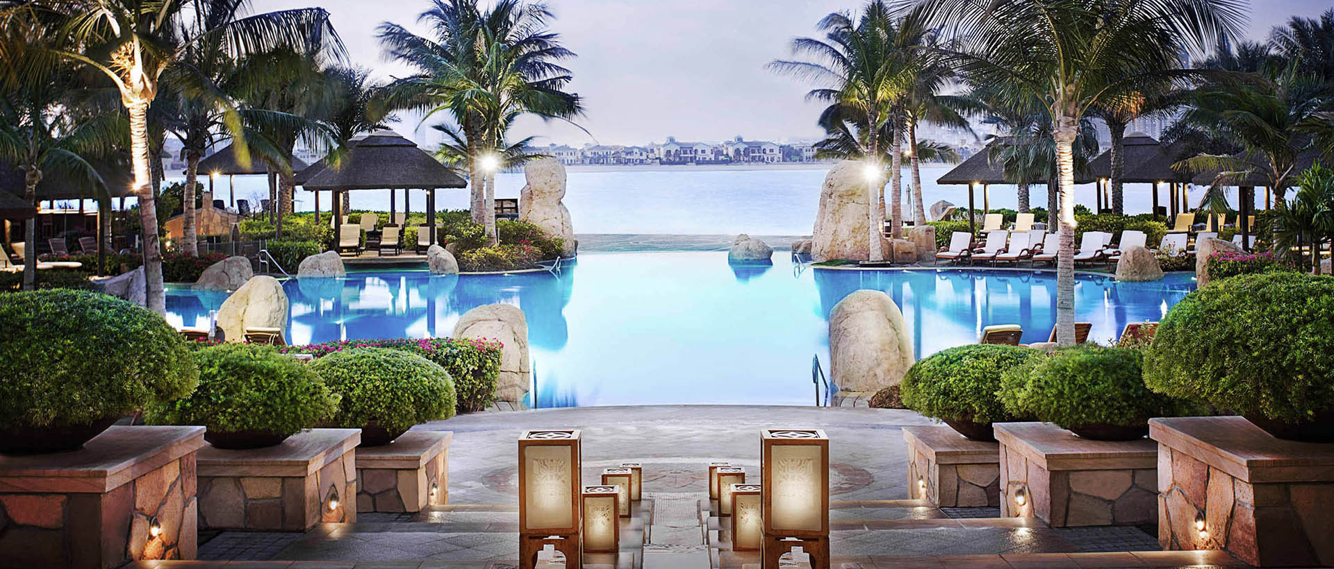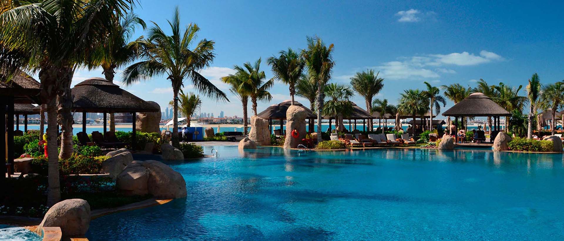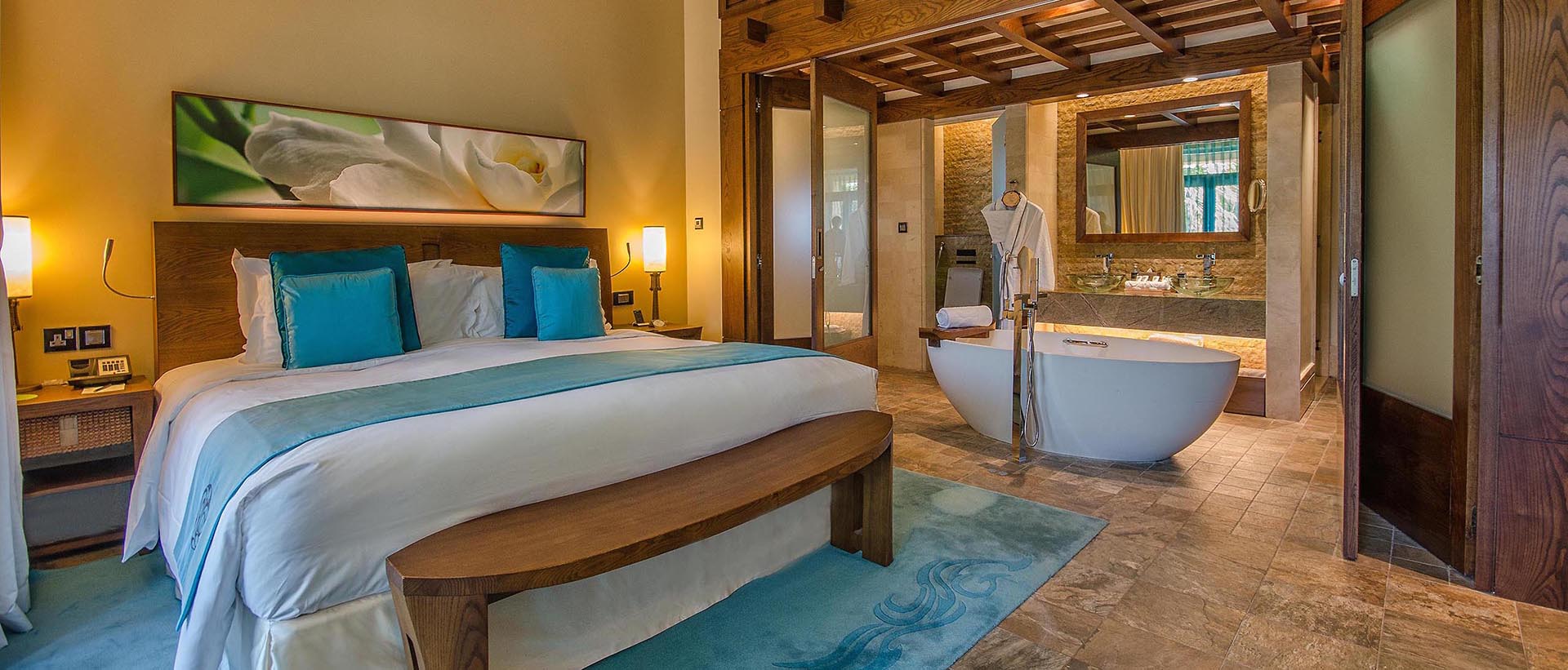 Пары и деловые люди оценят расслабляющую простоту роскошных номеров, которые смотрят либо на море, либо на Palm Jumeirah. Бирюзовые шторы напоминают спокойствие Аравийского залива, в то время как небольшие произведения искусства и отделка деревом ванной комнаты добавляют тропический оттенок.